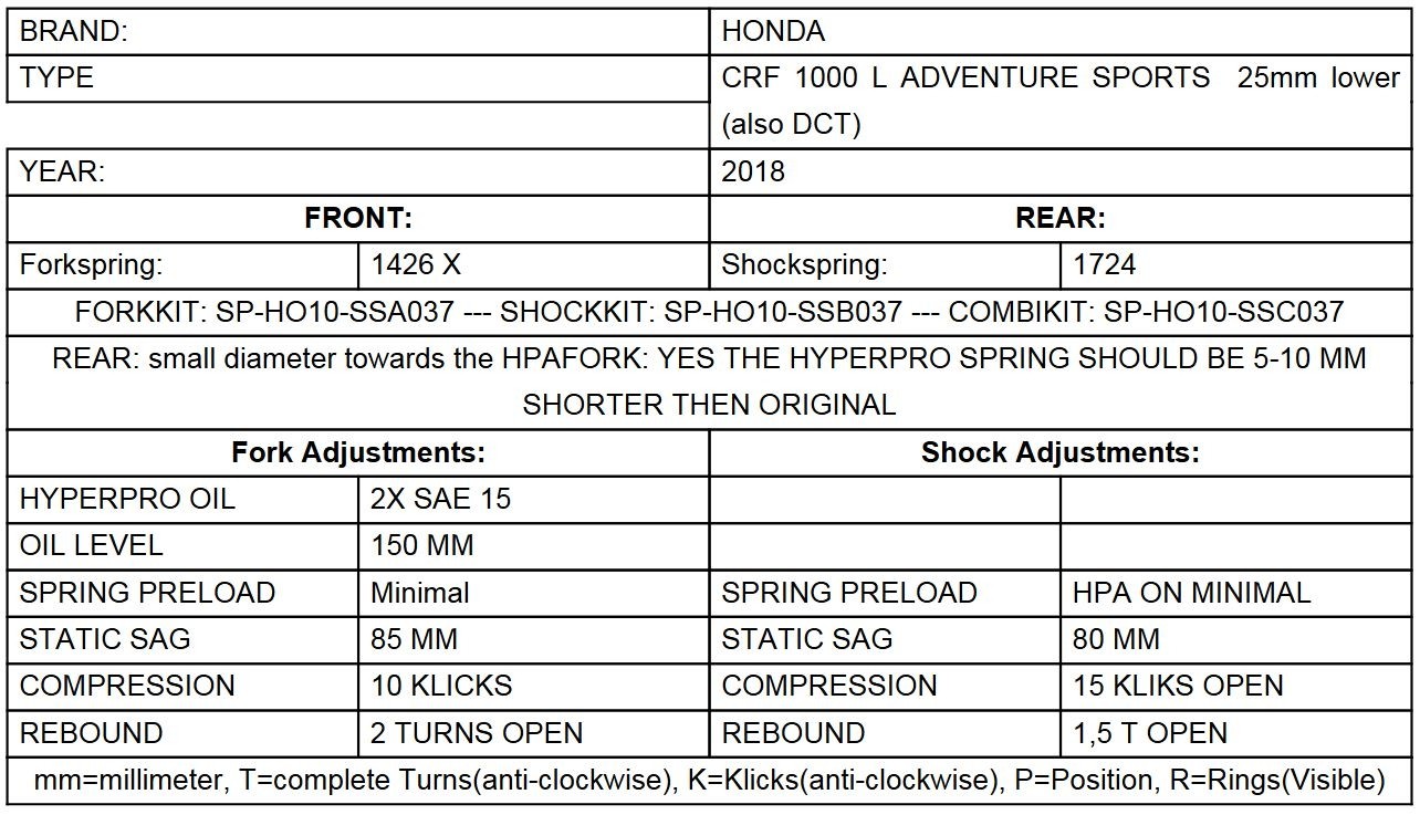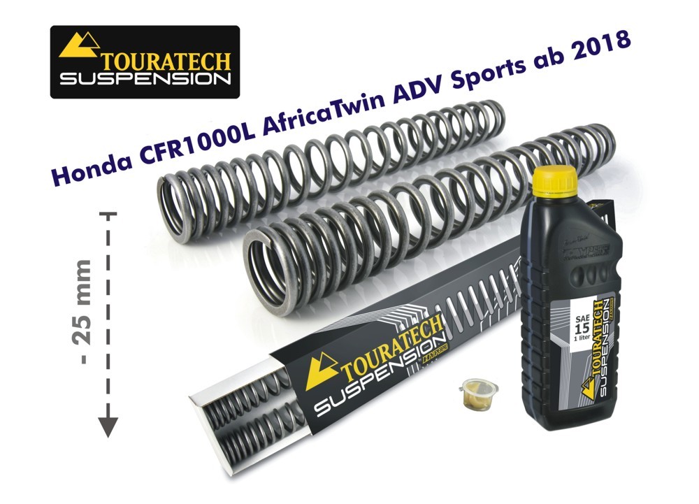 Eine Tieferlegung der Front mit Ersatzgabelfedern vom Holländischen Fahrwerksspezialisten Hyperpro. Durch diesen Federnsatz erzielen Sie eine sinnvolle Tieferlegung um 25mm ohne eine Verschlechterung der Fahreigenschaften - natürlich geht etwas Bodenfreiheit verloren. Die progressiven Federn sind perfekt auf die Honda CRF1000L ADV Sports abgestimmt und bieten ein deutlich verbessertes Ansprechverhalten und höhere Sicherheiten im Grenzbereich als die Original Gabelfedern .