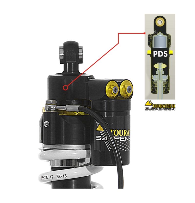 Dieses Federbein ist perfekt zur Reduzierung der Sitzhöhe (-25mm) bei der Honda CRF1000L geeignet. Gleichzeitig bleibt Ihre Honda CRF1100L Africa Twin sauber abgestimmt und sehr gut für den Tourenbetrieb geeignet. Dieses Federbein ist perfekt für den Touren- und Fahrbetrieb mit häufig und stark wechselnden Beladungs- und Fahrzuständen oder extremste Anforderungen entwickelt. So ist beim Extreme-Federbein das PDS verbaut, ein hydraulischer Durchschlagschutz durch Verwendung eines zweiten Dämpferkolbens. Selbst bei extremsten Pistenverhältnissen mit vollem Reisegepäck kommt es zu keinem Durchschlagen, eine mechanische Überlastung des Federbeins wird verhindert. Die Dämpfung arbeitet wegabhängig. Im überwiegenden Fahrbetrieb ist das Federbein komfortabel und kräfteschonend justiert, bevor im letzten Teil des Federbeinhubs das PDS eingreift.