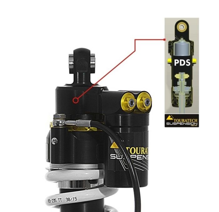 Dieses Federbein ist perfekt zur Reduzierung der Sitzhöhe (-40mm) bei der Honda CRF1000L geeignet. Gleichzeitig bleibt Ihre Honda CRF 1000L Adventure Sports sauber abgestimmt und sehr gut für den Tourenbetrieb geeignet. Dieses Federbein ist perfekt für den Touren- und Fahrbetrieb mit häufig und stark wechselnden Beladungs- und Fahrzuständen oder extremste Anforderungen entwickelt. So ist beim Extreme-Federbein das PDS verbaut, ein hydraulischer Durchschlagschutz durch Verwendung eines zweiten Dämpferkolbens. Selbst bei extremsten Pistenverhältnissen mit vollem Reisegepäck kommt es zu keinem Durchschlagen, eine mechanische Überlastung des Federbeins wird verhindert. Die Dämpfung arbeitet wegabhängig. Im überwiegenden Fahrbetrieb ist das Federbein komfortabel und kräfteschonend justiert, bevor im letzten Teil des Federbeinhubs das PDS eingreift.