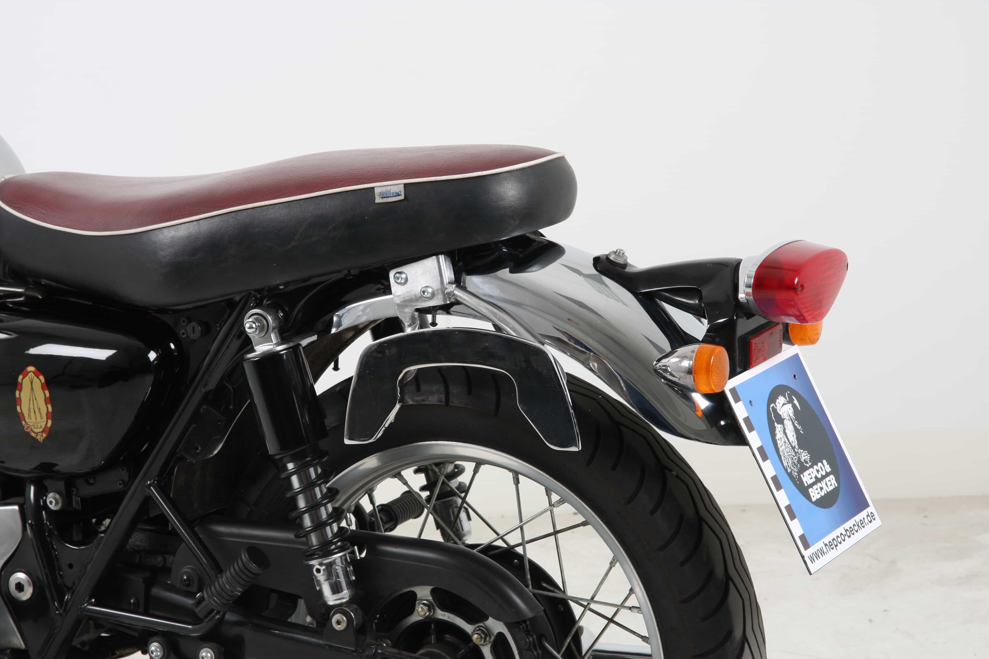 C-Bow Seitentaschenhalter für Kawasaki W 650 (1999-2006)/W 800 (2011-2016) ist für die Aufnahme einer Vielzahl von Hepco&Becker Taschen vorgesehen. Softbags für sportlich-dynamische Motorräder und Satteltaschen für Chopper und Cruiser können mit dem C-Bow Halter am Motorrad befestigt werden. Sein elegantes, unaufdringliches Design fügt sich perfekt in die Gesamtlinie des Fahrzeugs ein. Natürlich hält er die Satteltaschen sicher vom heißen Auspufftopf fern. Dank moderner C-Bow Technik lassen sich die passenden Taschen einfach und unkompliziert mit nur einem Klick am C-Bow befestigen und diebstahlsicher verriegeln. Die Taschen sind sicher am Motorrad befestigt und bleiben auch bei Beladung in Position. Bei vielen Modellen verbleiben die Blinker in ihrer Originalposition. Weitere Informationen finden Sie in der Anbauanleitung.solider Seitenträger zur Aufnahme von Hepco&Becker C-Bow Seitentaschen und Koffernhochwertiges Oberflächenfinishnormale Hepco&Becker Hartschalenkoffer, wie die Junior oder Journey passen nicht!Krauser K-Wing Koffer passen nicht an den C-Bow Träger!Empfohlene Zuladung: 5kg je Tasche/Koffer (bitte beachten Sie die Montageanleitung, fahrzeugspezifische Hinweise, sowie Motorradherstellerangaben für evtl. auftretende Einschränkungen)meist ohne Probleme mit Topcaseträger, Sissybar, oder Solorack kombinierbar (beachten Sie die Anbauanleitung oder die fahrzeugspezifischen Hinweise beim jeweiligen Träger)Gepäckbrückenverbreiterungen können die Taschenmontage am Träger einschränkenGepäckträger benötigen keine ABE oder Eintragung in die Papiere Lieferumfang: links, rechts, Anbaumaterial und AnleitungEntwickelt für den Serienzustand der Maschine. Nicht getestet mit Zubehörartikeln wie z.B: Auspuff, Kennzeichenhalter oder anderen Blinkern. Beachten Sie, dass die Taschen bei Fremdzubehör immer ausreichend Abstand zum Auspuff und die Blinker einen ausreichenden Abstrahlwinkel haben. Der Abgasstrahl darf nicht auf die Taschen gerichtet sein.