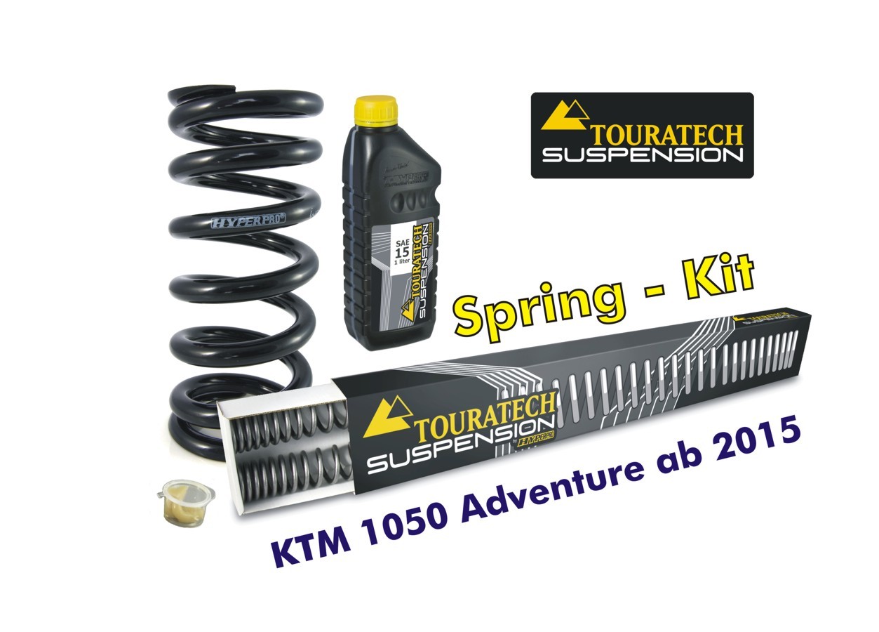 Diese progressiven Austauschfedern sind perfekt auf die Gabel und das Federbein der KTM 1050 Adventure abgestimmt. Das Federbein und die Gabel haben so eine bessere Abstimmung für die Anforderungen des Motorradreisens. Zu dem werden sie ein deutlich verbessertes Ansprechverhalten und höhere Reserven im Grenzbereich erfahren. Die Austauschfedern werden vom holländischen Fahrwerksspezialisten Hyperpro in Europa gefertigt.