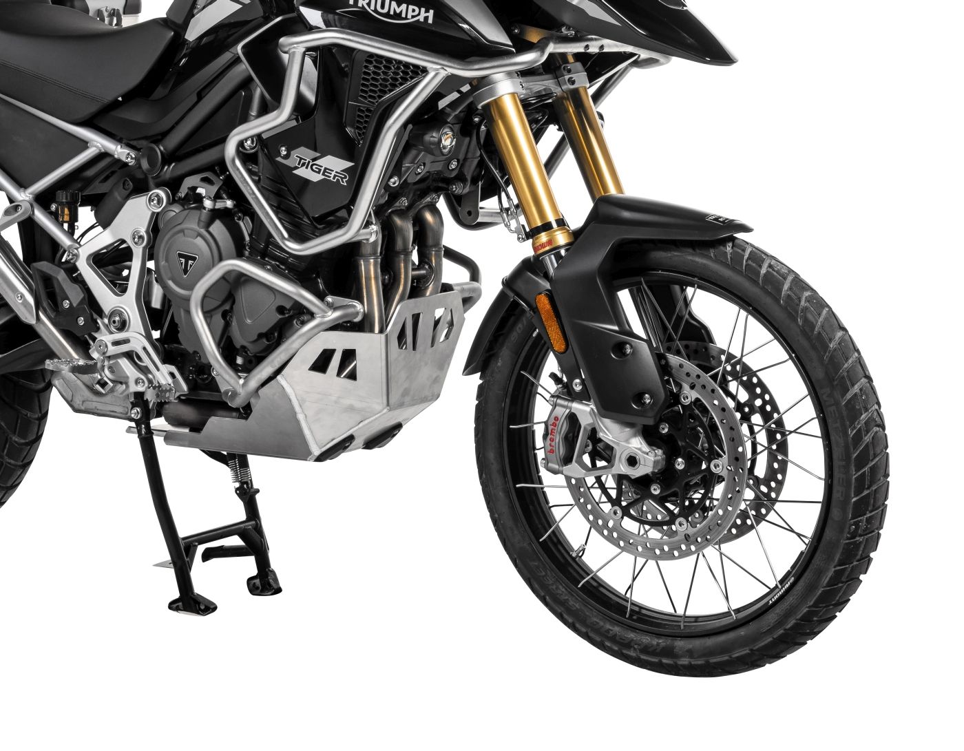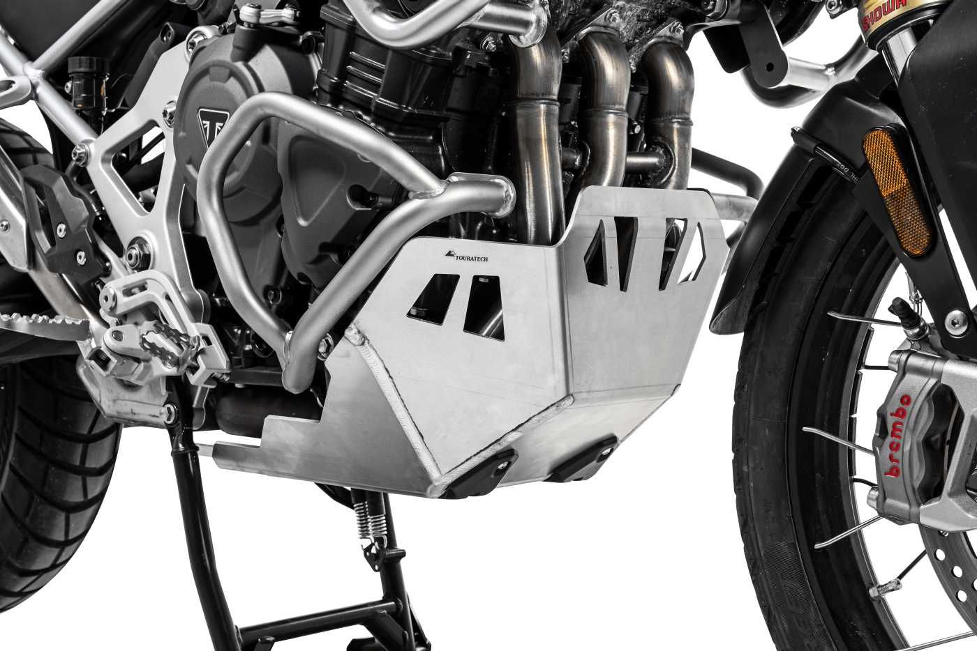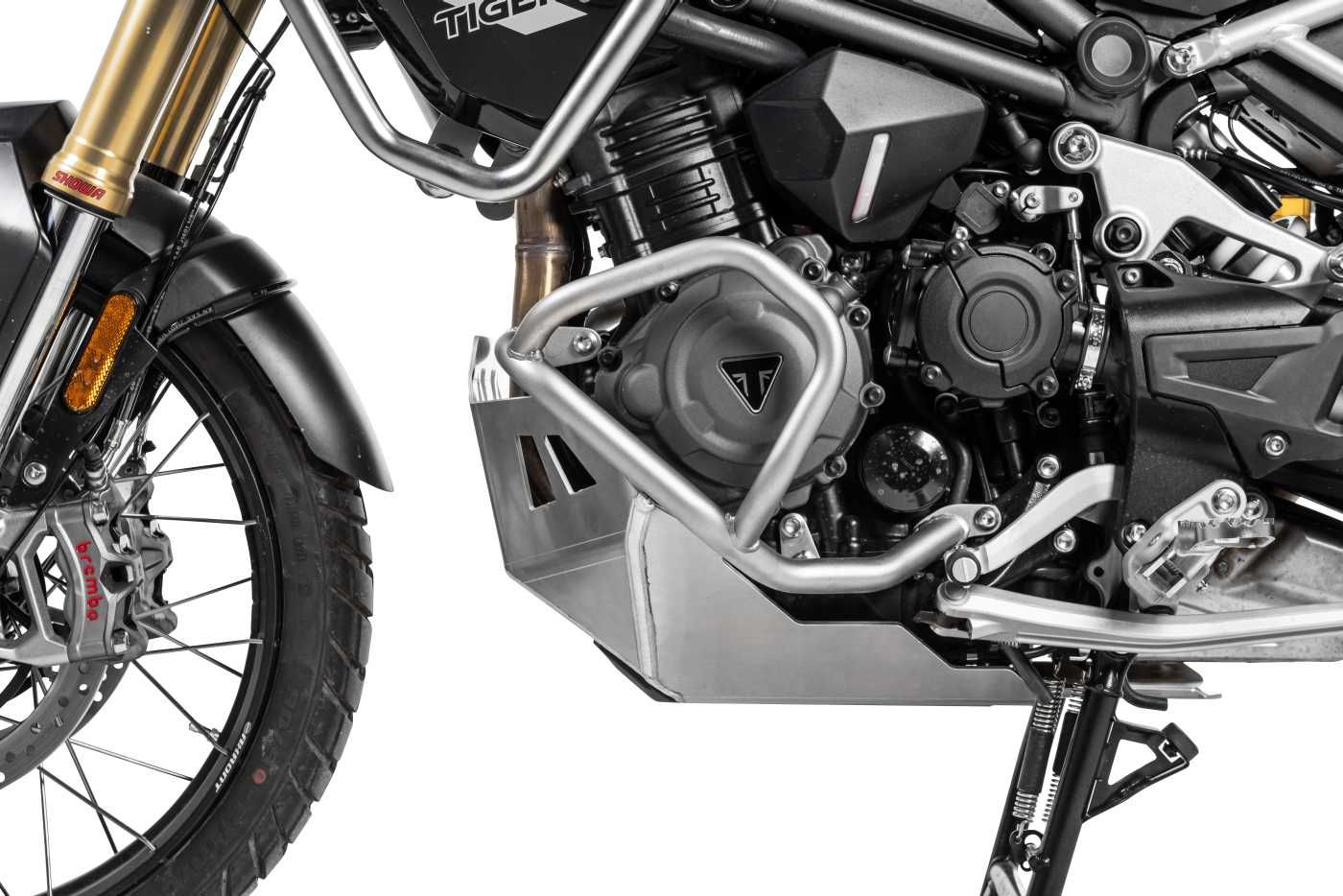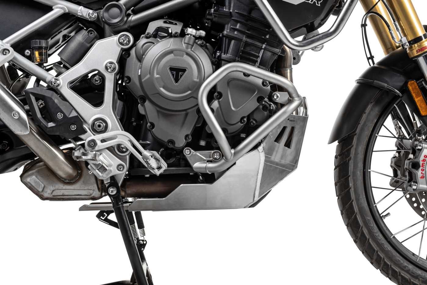 Der Motorschutz der 1200er Tiger ist im vorderen Bereich so weit nach oben gezogen, dass aufgewirbelte Steine dem Motorblock nichts abhaben können.