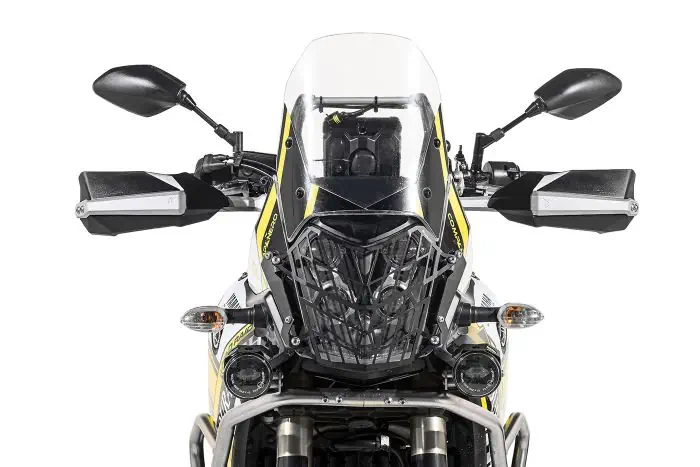 Die Lenkerarmaturen zählen zu den besonders gefährdeten Baugruppen eines Motorrades. Der solide Protektor schützt die Hebeleien zuverlässig vor Beschädigung. Die geschlossenen Protektoren haben einen Bügel, der sich nahe der Klemmböcke sowie am Lenkerende abstützt und so die Armatur komplett umrahmt. Dieses Prinzip hat sich bei Rallyemotorrädern unter härtesten Bedingungen bewährt.