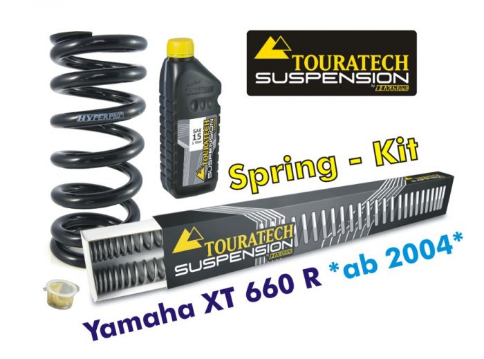 Diese progressiven Austauschfedern sind perfekt auf die Gabel und das Federbein der Yamaha XT660R abgestimmt. Das Federbein und die Gabel haben so eine bessere Abstimmung für die Anforderungen des Motorradreisens. Zu dem werden sie ein deutlich verbessertes Ansprechverhalten und höhere Reserven im Grenzbereich erfahren. Die Austauschfedern werden vom holländischen Fahrwerksspezialisten Hyperpro in Europa gefertigt.