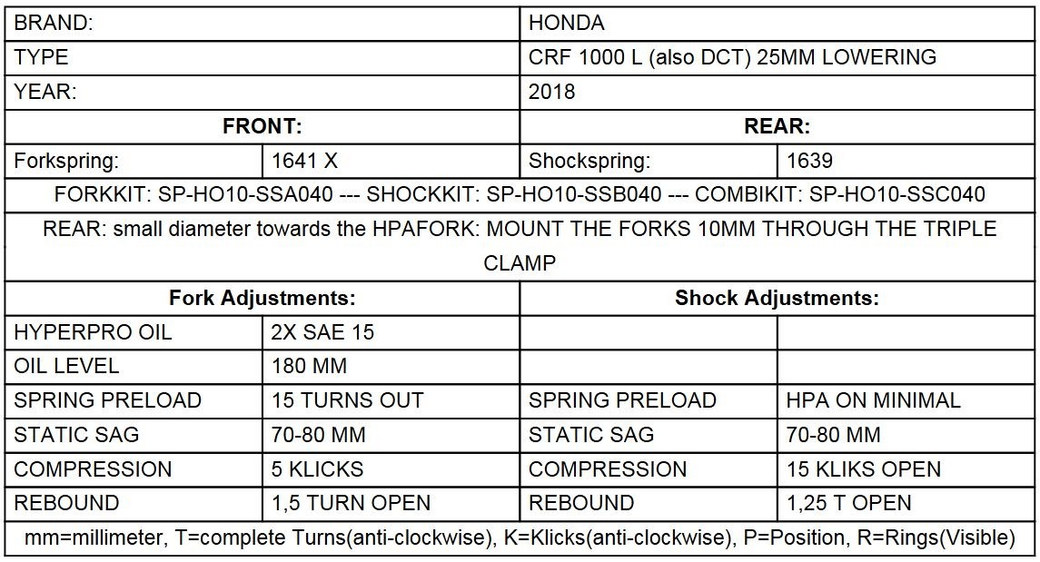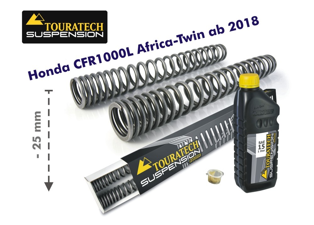Eine Tieferlegung der Front mit Ersatzgabelfedern vom Holländischen Fahrwerksspezialisten Hyperpro. Durch diesen Federnsatz erzielen Sie eine sinnvolle Tieferlegung um 25mm ohne eine Verschlechterung der Fahreigenschaften - natürlich geht etwas Bodenfreiheit verloren. Die progressiven Federn sind perfekt auf die Honda CRF1000L Africa Twin abgestimmt und bieten ein deutlich verbessertes Ansprechverhalten und höhere Sicherheiten im Grenzbereich als die Original Gabelfedern .