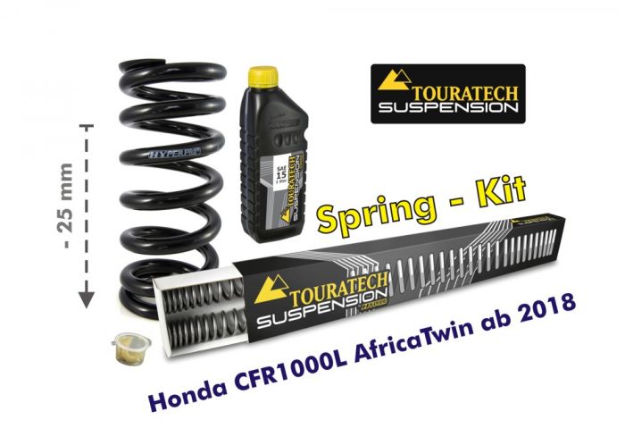 Der Touratech Suspension Tieferlegungssatz vom Holländischen Fahrwerksspezialisten Hyperpro. Im Set sind Austauschgabelfedern und eine Austauschfeder für das Federbein enthalten. Durch diesen Federnsatz erzielen Sie eine sinnvolle Tieferlegung um 25 mm bei gleichbleibend guten Fahreigenschaften - natürlich geht etwas Bodenfreiheit verloren. Die progressiven Federn sind perfekt auf die Honda CRF1000L Africa Twin abgestimmt. Das Fahrwerk bietet nach dem Umbau ein deutlich verbessertes Ansprechverhalten und höhere Sicherheiten im Grenzbereich. Durch den Austausch der Federn vorne und hinten bleibt die Balance Ihres Motorrades erhalten.