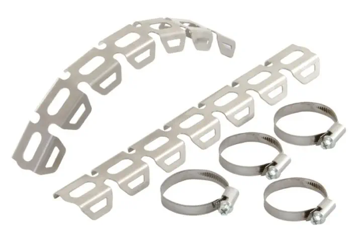 Dieser Hitzeschutz wird aus lasergeschnittenem Edelstahl gefertigt. Die spezielle Konstruktion ermöglicht ein einfaches individuelles Anpassen an jede Krümmerbiegung.