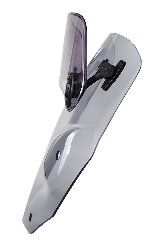 Die X-creen-Scheibe besteht aus einer Basis-Scheibe und dem vielfach verstellbaren X-creen-Spoiler. Der Lieferumfang beinhaltet zwei Gelenk-Versionen: Einfachgelenk „S“ und Doppelgelenk “D“, die wahlweise montiert werden können. Variante „S“ ist für Kunden zu empfehlen, die mit der Scheibenhöhe gut zurechtkommen und nur den Spoilerwinkel verstellen möchten. Kunden, denen die Variante „S“ zu hoch oder zu niedrig ist, können mit der Variante „D“ die Höhe des Spoilers um 110mm verstellen und dabei auch den Spoilerwinkel, unabhängig von der Höhe, sowie den Abstand zur Basisscheibe verstellen. Dadurch lässt sich X-Creen optimal auf die individuellen Bedürfnisse des Fahrers einstellen.