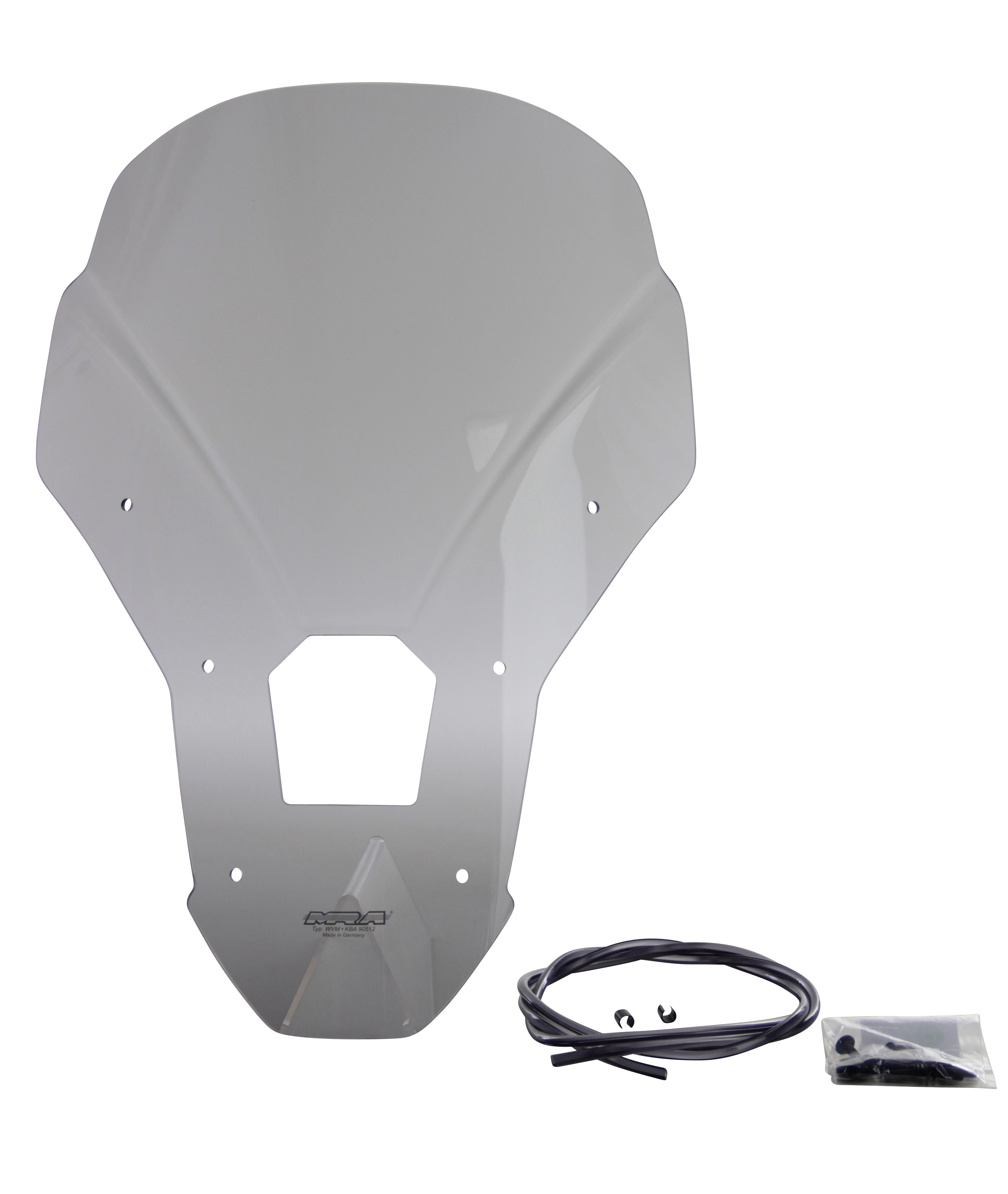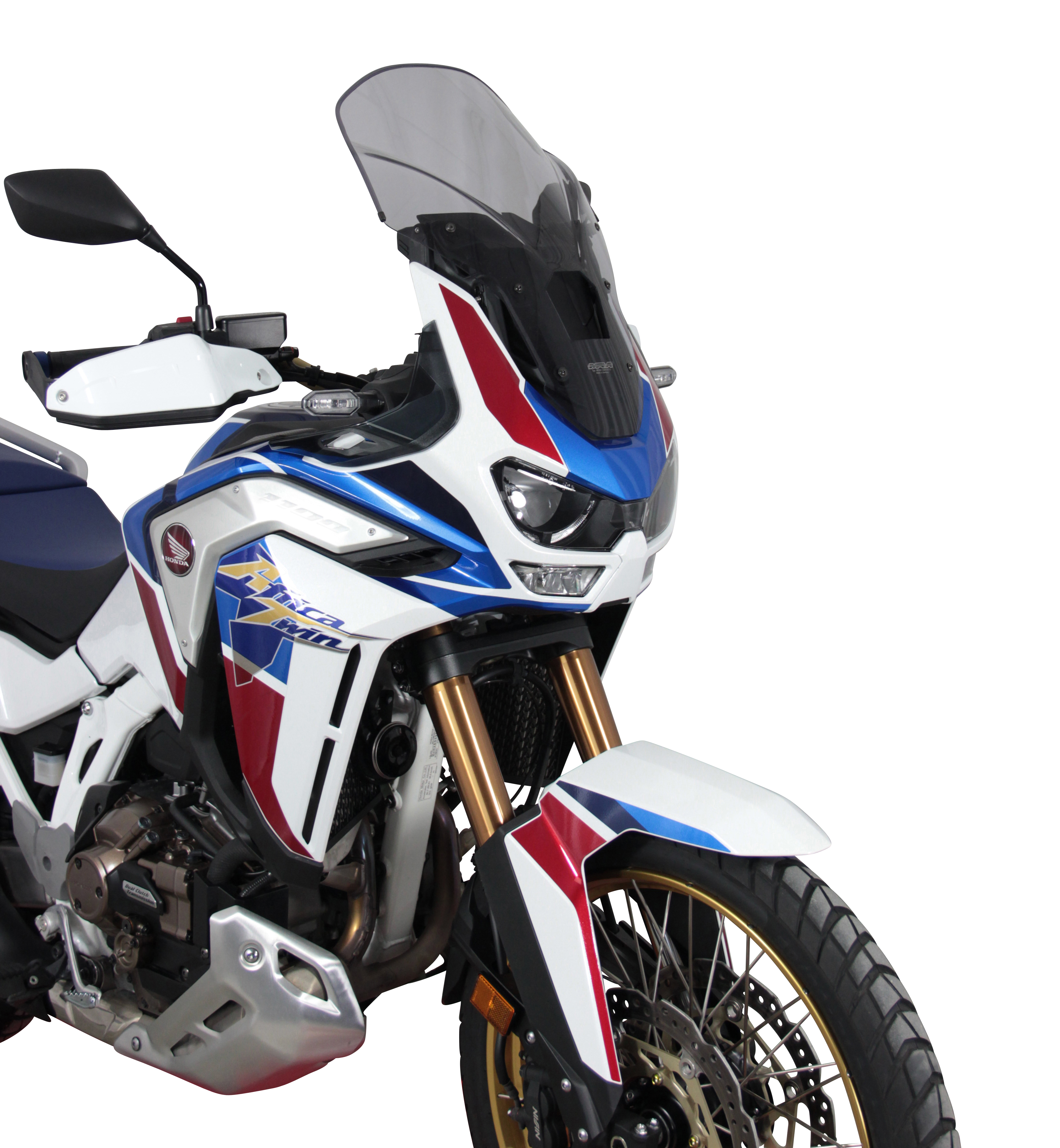 Die 2020er Africa Twin Adventure Sports ist 5cm niedriger und 4cm schlanker als ihre Vorgängerin und begeistert mit dem elektronischen Fahrwerk und dem feinen DCT. Die MRA-Tourenscheibe (TM) ist ähnlich lang wie die lange Erstausrüsterscheibe (53,5cm) bzw. 8,5cm länger als die kurze Erstausrüsterscheibe und bietet guten Windschutz. Sie ist in unauffälligem Farblos, pflegeleichten Rauchgrau oder schickem Schwarz erhältlich. Die Tourenscheibe 36,5cm breit und lässt sich mit wenigen Schrauben und Distanzhülsen schnell und einfach montieren.